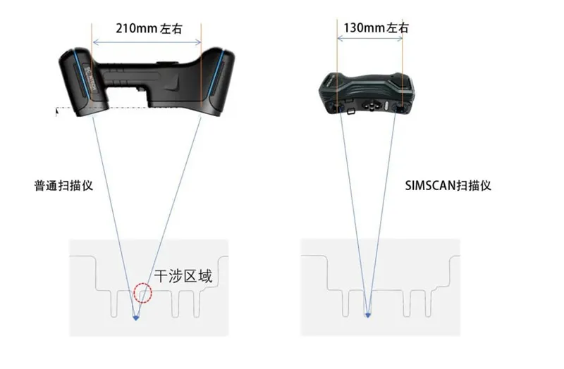 三維掃描器掃描過程中,需要左右兩個相機同時看到投射到物體的激光線。 SIMSCAN相機間距比普通三維掃描器小,所以在掃描槽底部及接近底部側壁時具有優勢,能夠保證掃描視角不會被遮擋,能採集到更為完整的三維數據。